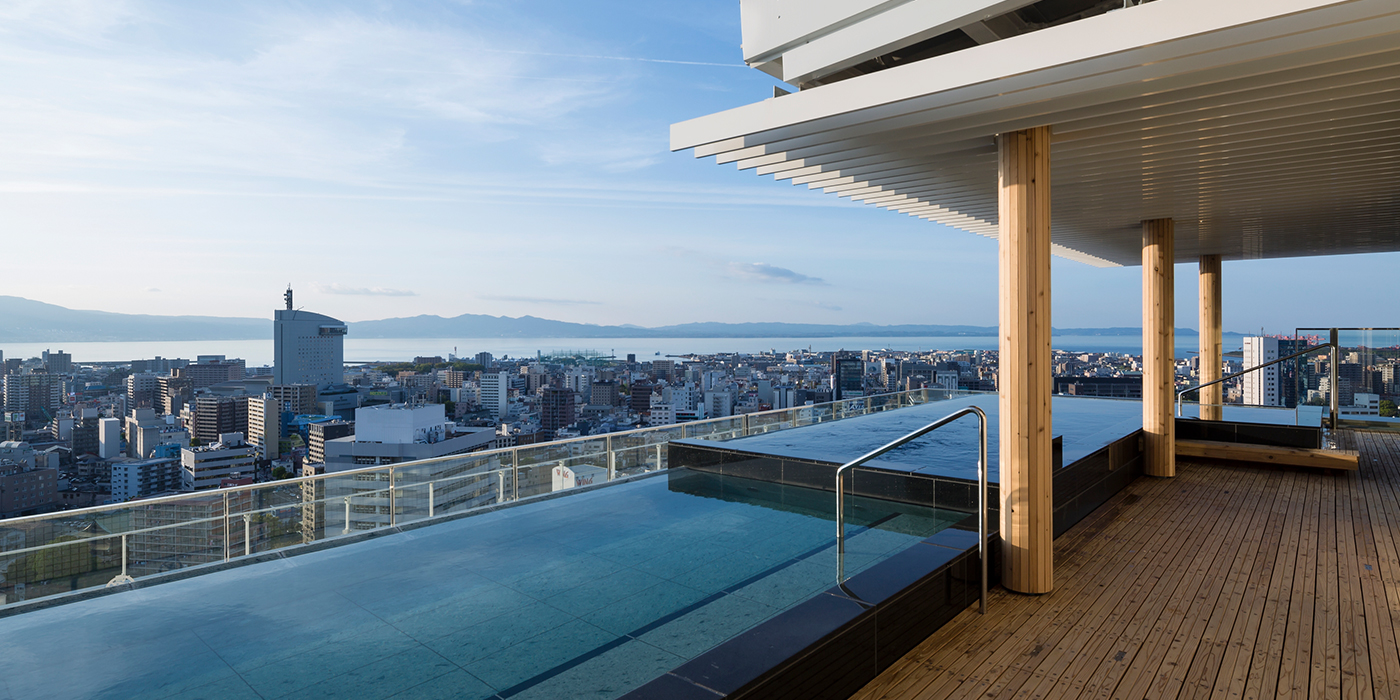 JR大分駅直結のサウナ&インフィニティ温泉。地上80m、大分の豊かな海と山を見渡せる圧倒的な開放感の中で、天然温泉と高濃度炭酸泉の2つの魅力が楽しめるスポット。サウナ後は、大分で有名なとり天を食べて食も充実させることの出来る、都市型絶景サウナ。